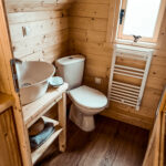 Im hinteren Bereich des Eifelhüttchens befindet sich das Bad mit Dusche, WC, Waschbecken und kleinem Fenster.