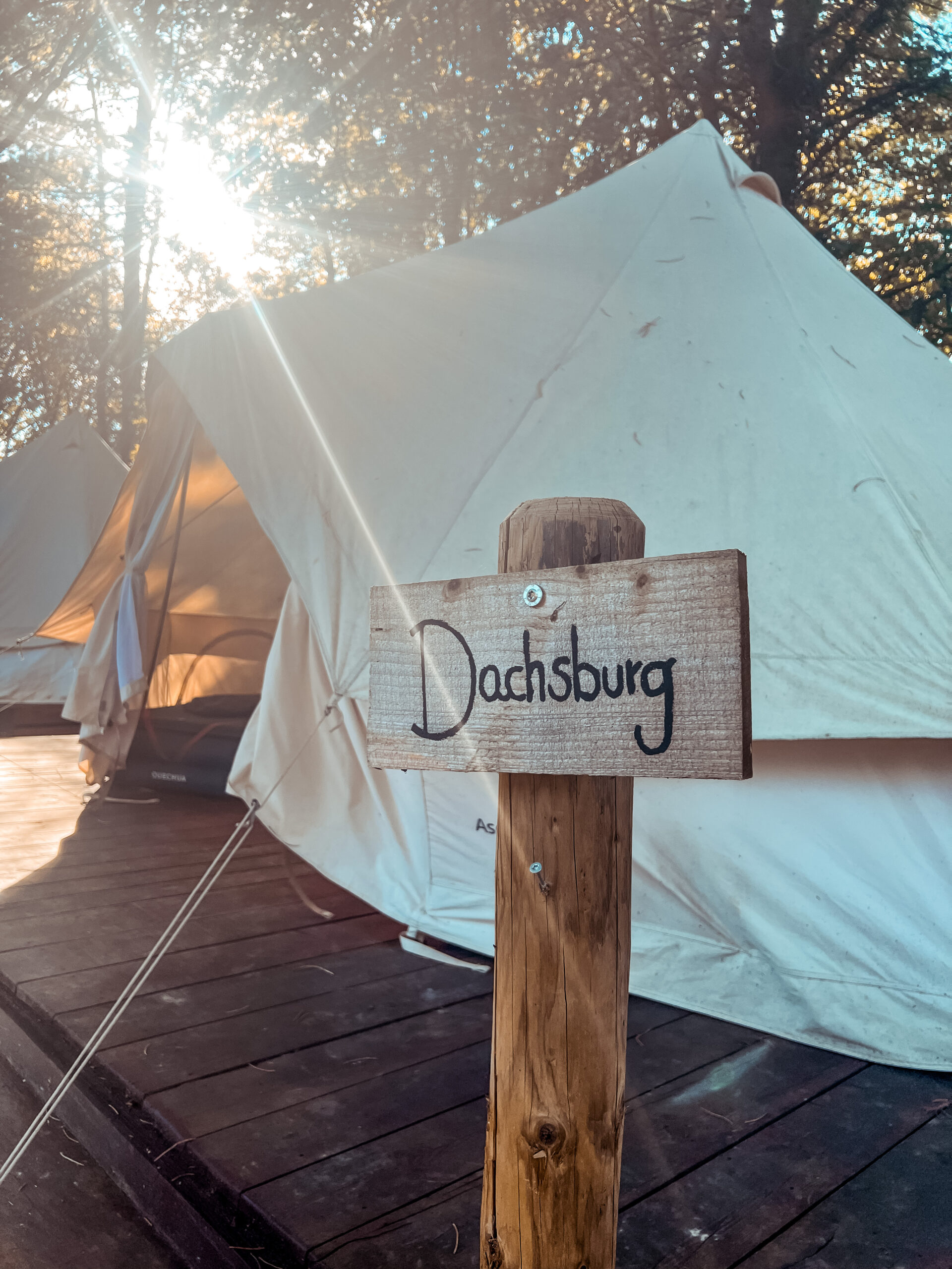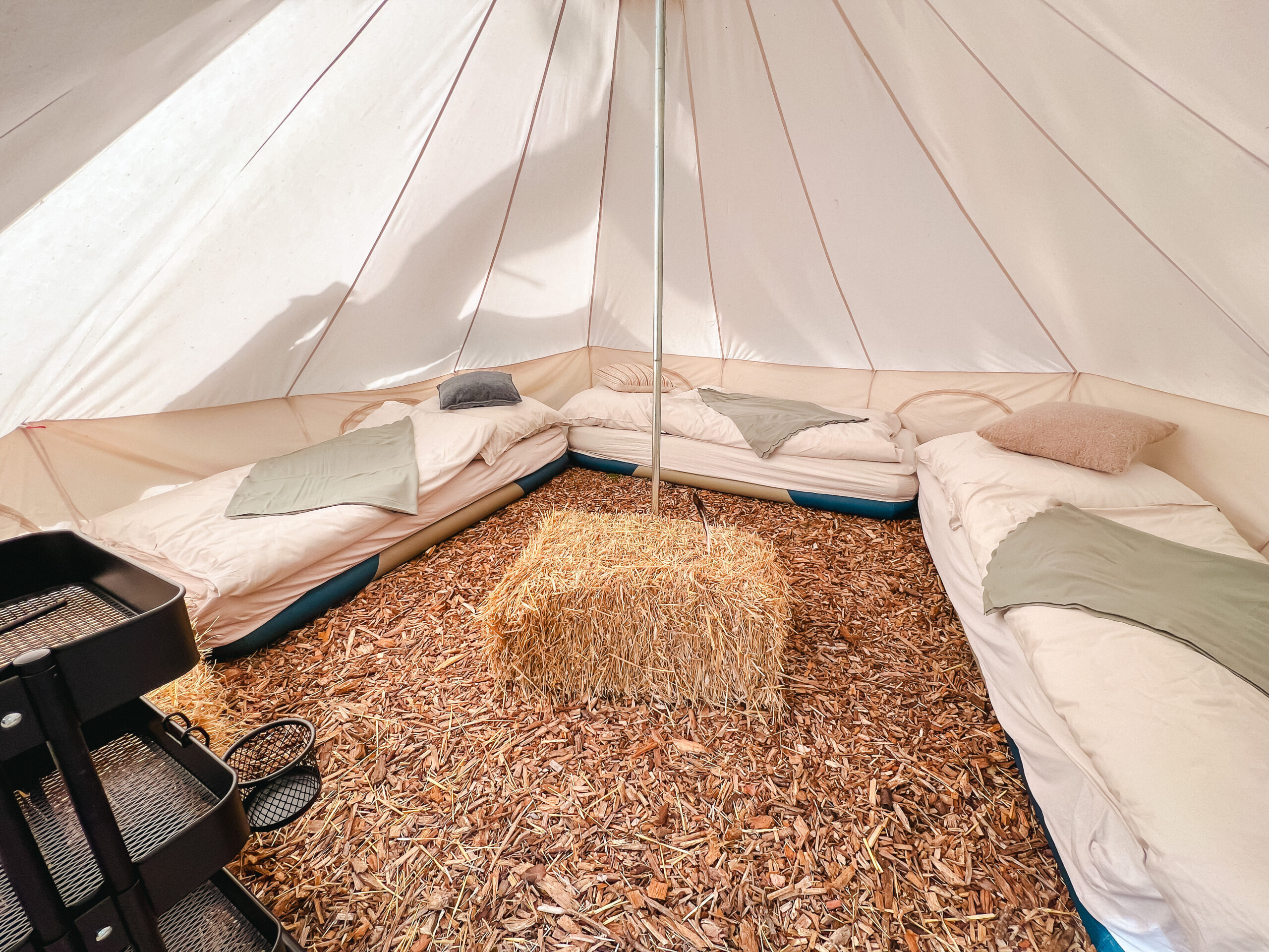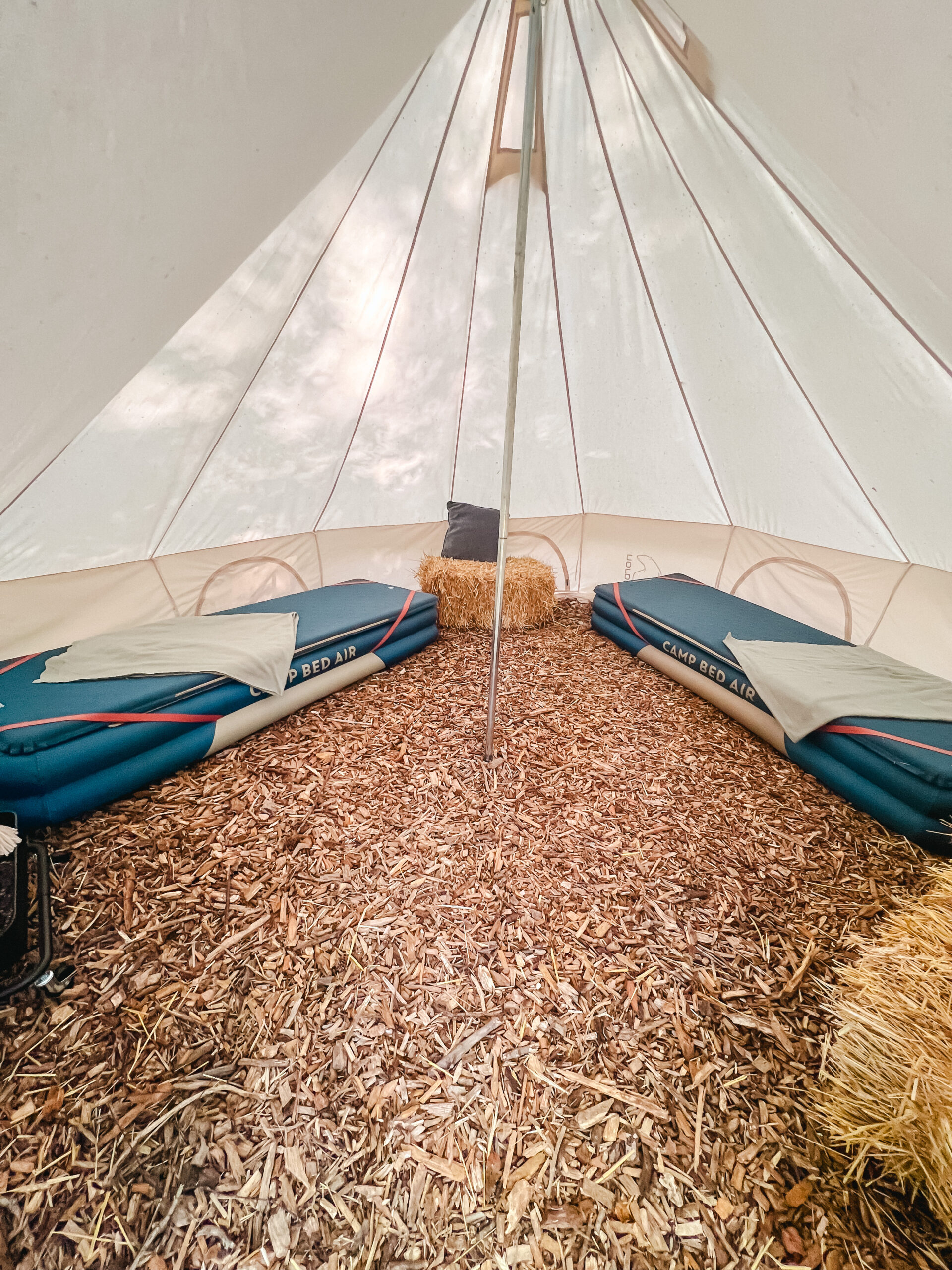 Zusätzlich haben wir noch zwei kleinere Glampingzelte von je 12qm, die auf einem Hackschnitzeluntergrund stehen.
