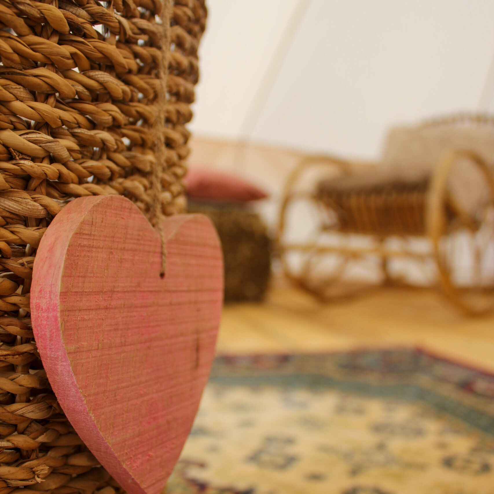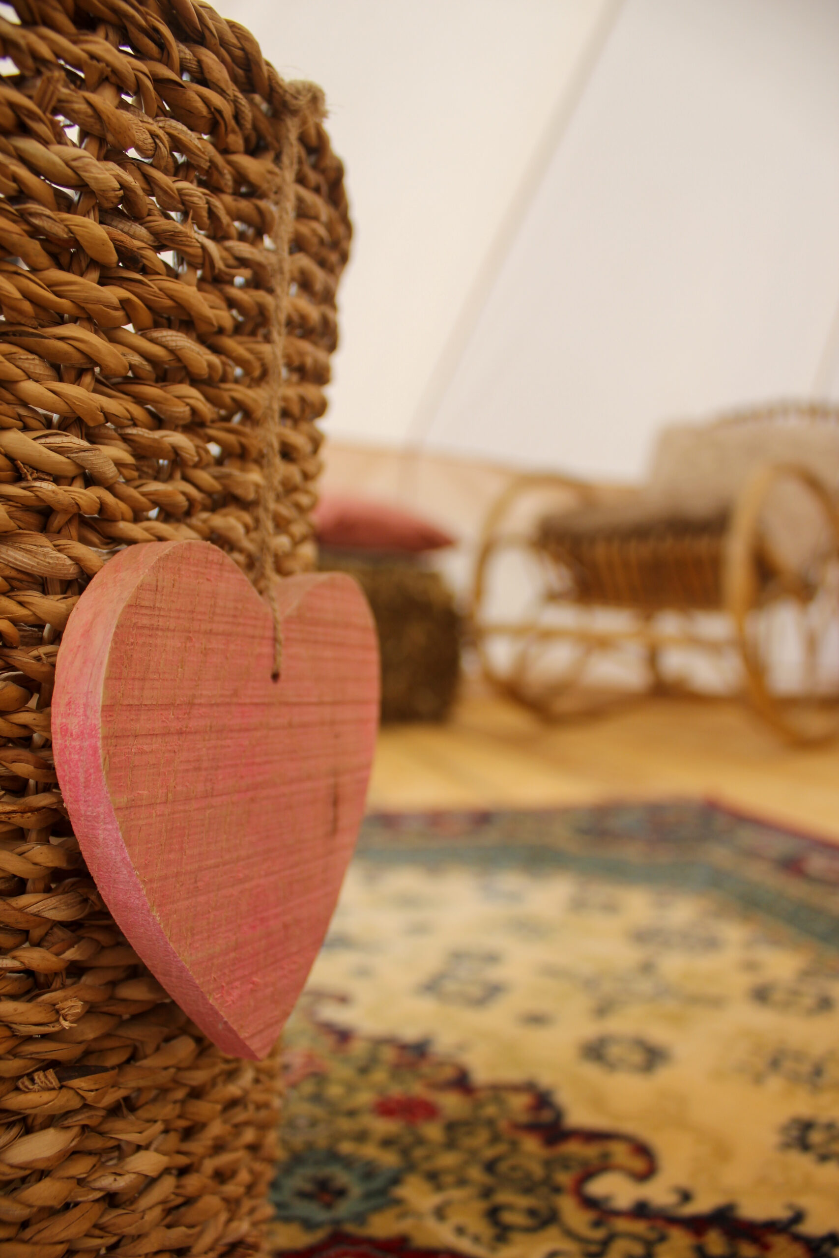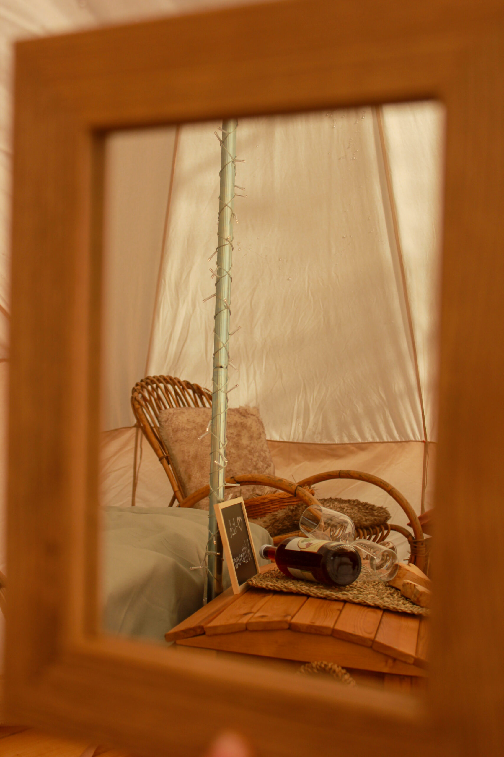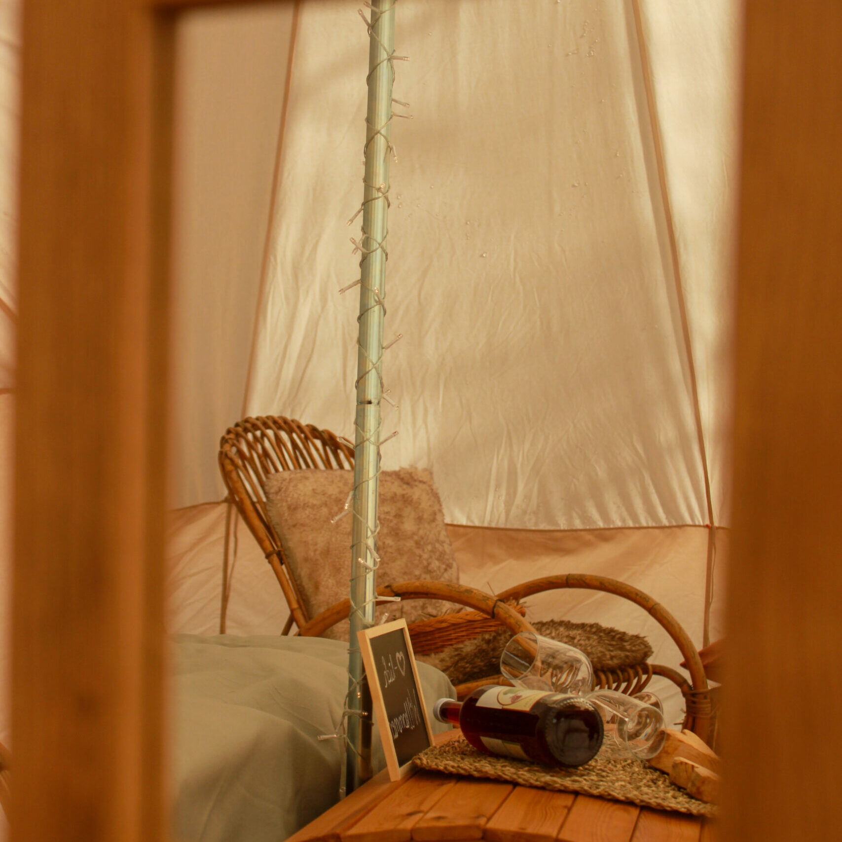 Zusätzlich haben wir noch zwei kleinere Glampingzelte von je 12qm, die auf einem Hackschnitzeluntergrund stehen.