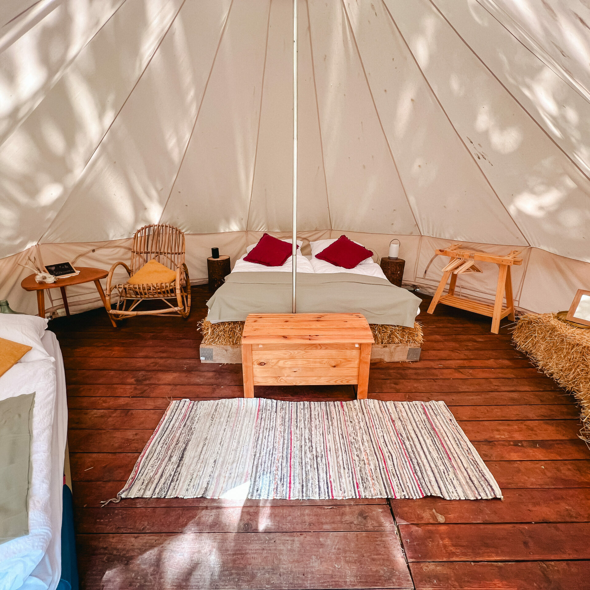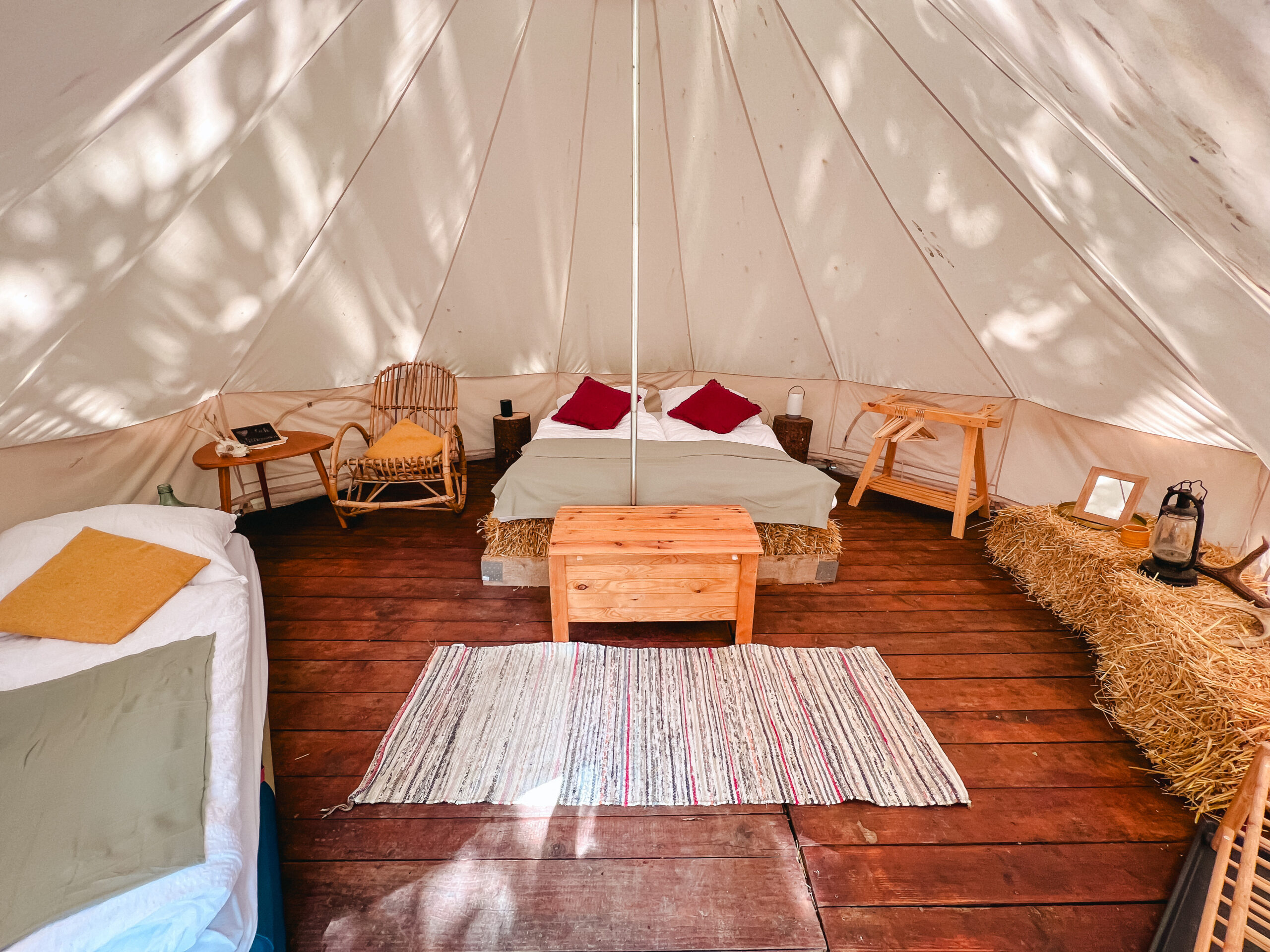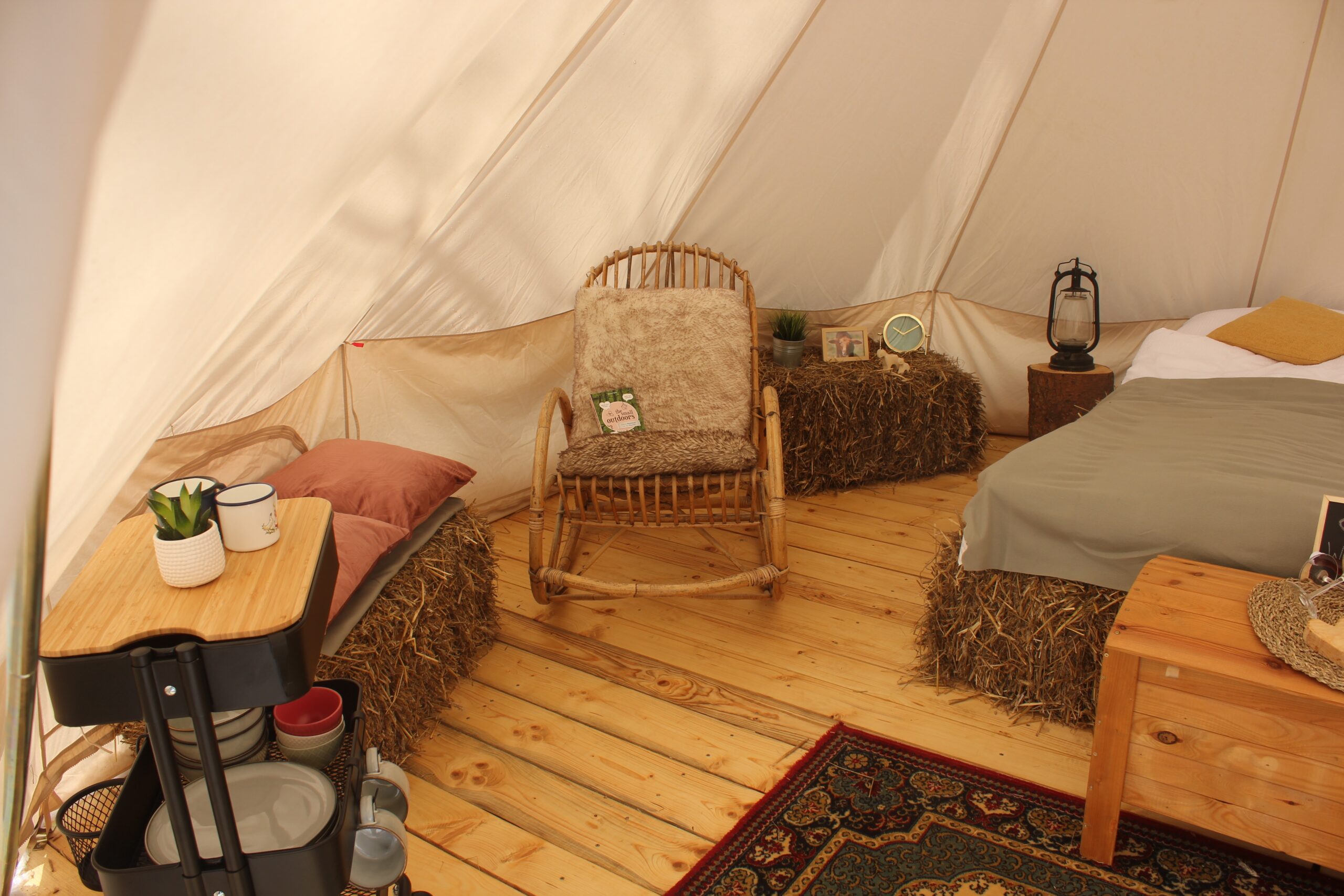 Unsere drei großen Glampingzelte von 20qm stehen auf Holzplattformen und haben eine kleine Außenterasse. Besonders sind die Betten aus Stroh. Daher und auch wegen dem hohen Baumwollanteil der Zelte herrscht ein sehr angenehmes Raumklima. Alle Zelte verfügen über ein Doppelbett, Kleiderstange und Sitzgelegenheiten. Geschirr, Besteck und Kochutensilien finden die Glampinggäste im kleinen Hofladen.