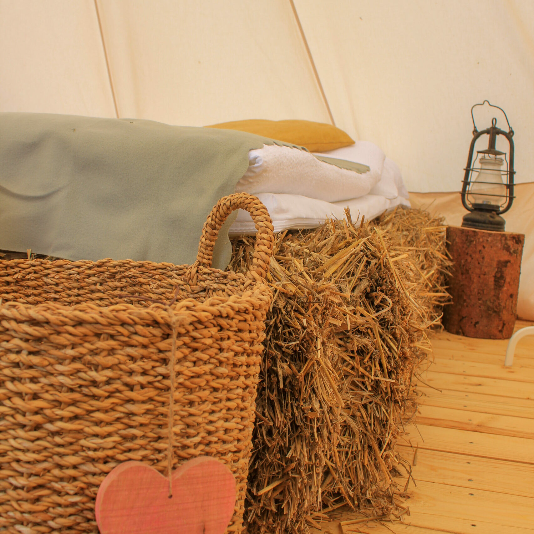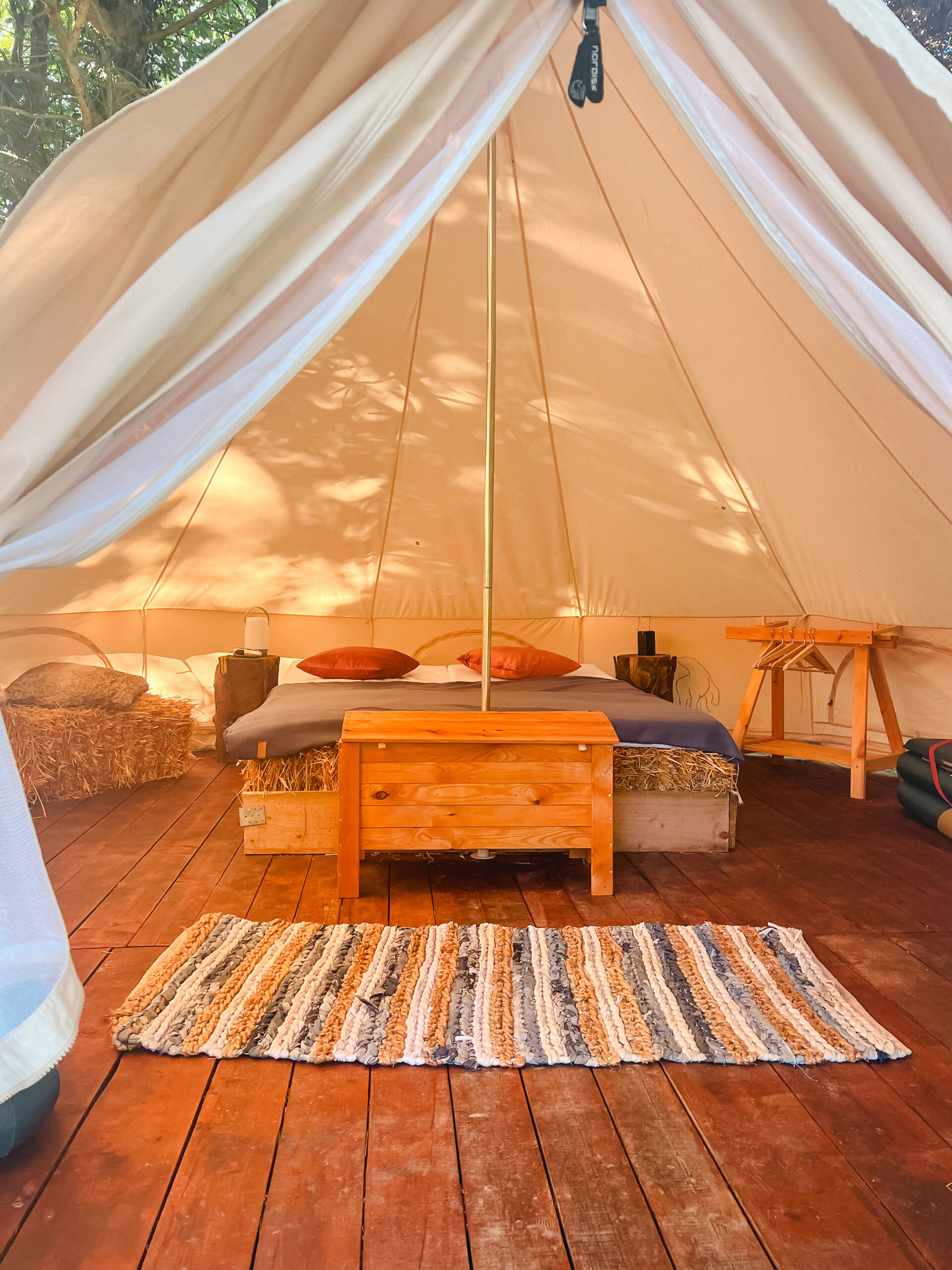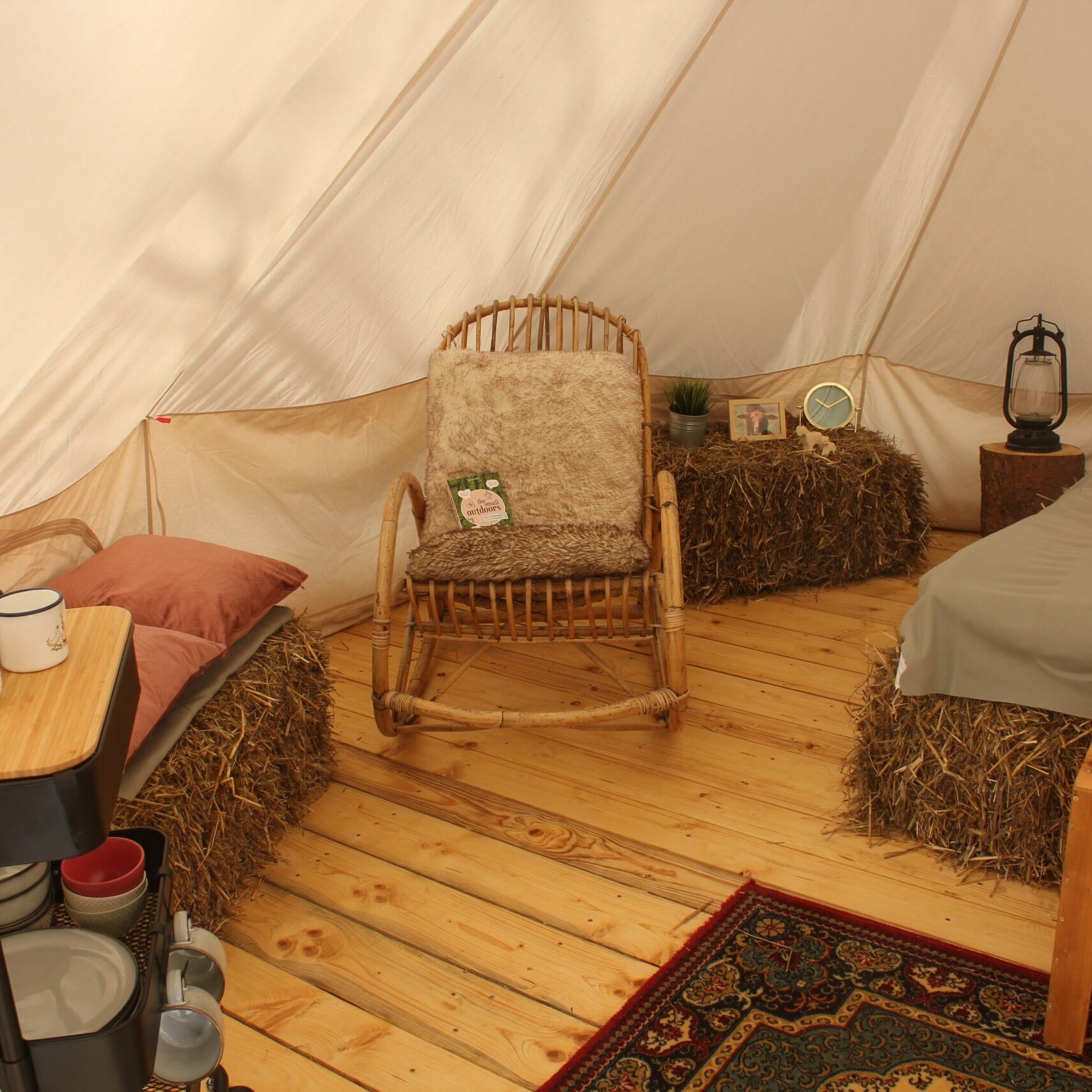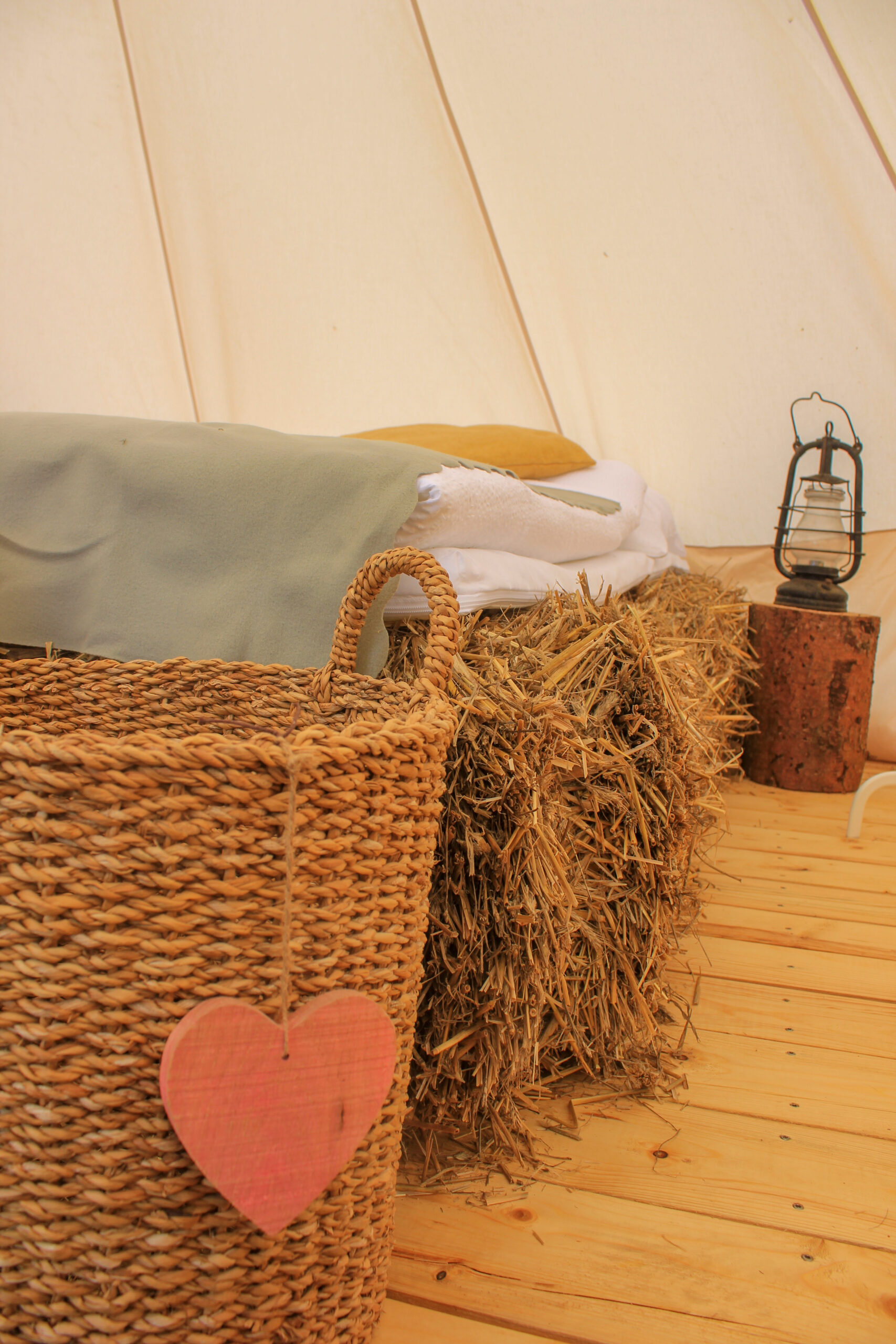 Unsere drei großen Glampingzelte von 20qm stehen auf Holzplattformen und haben eine kleine Außenterasse. Besonders sind die Betten aus Stroh. Daher und auch wegen dem hohen Baumwollanteil der Zelte herrscht ein sehr angenehmes Raumklima. Alle Zelte verfügen über ein Doppelbett, Kleiderstange und Sitzgelegenheiten. Geschirr, Besteck und Kochutensilien finden die Glampinggäste im kleinen Hofladen.